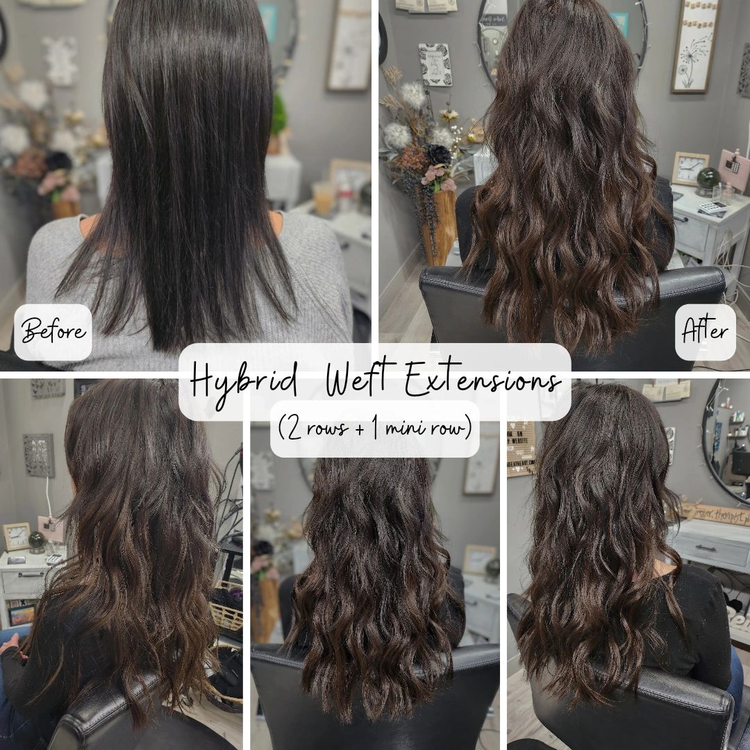 Hybrid wefts are the new breed of hand tied & machine sewn wefts. Seamless & virtually invisible, like hand tied, with the durability of machine sewn. The best of both! This application is offered in partial or full service & adds tons of fullness & length. I am certified & just finished up working on a few models. I'm so excited to be able to offer this service to ALL CLIENTS now!!